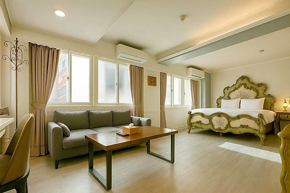 This suite features a double bed, air conditioning, flat-screen TV, electric kettle and free bottled water.